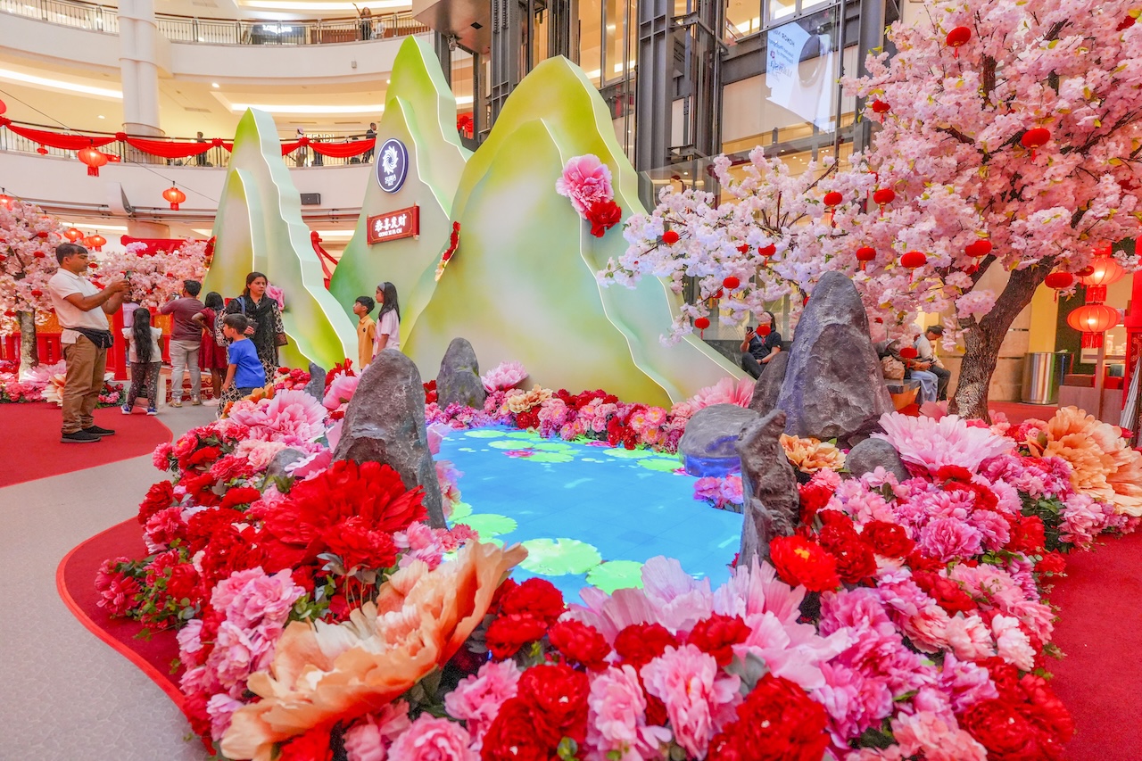 At the heart of it all, Suria KLCC’s Centre Court has been transformed into an immersive festive landscape anchored by a striking Oriental Horse Carousel. Framed by sculpted mountains, cherry blossoms, and traditional architectural elements, the installation blends cultural elegance with playful nostalgia. Families, friends, and visitors linger to soak in the details—pausing for photos, making wishes at the Lotus Pond of Blessings, or simply enjoying the rhythm of the rotating carousel that evokes childhood joy.