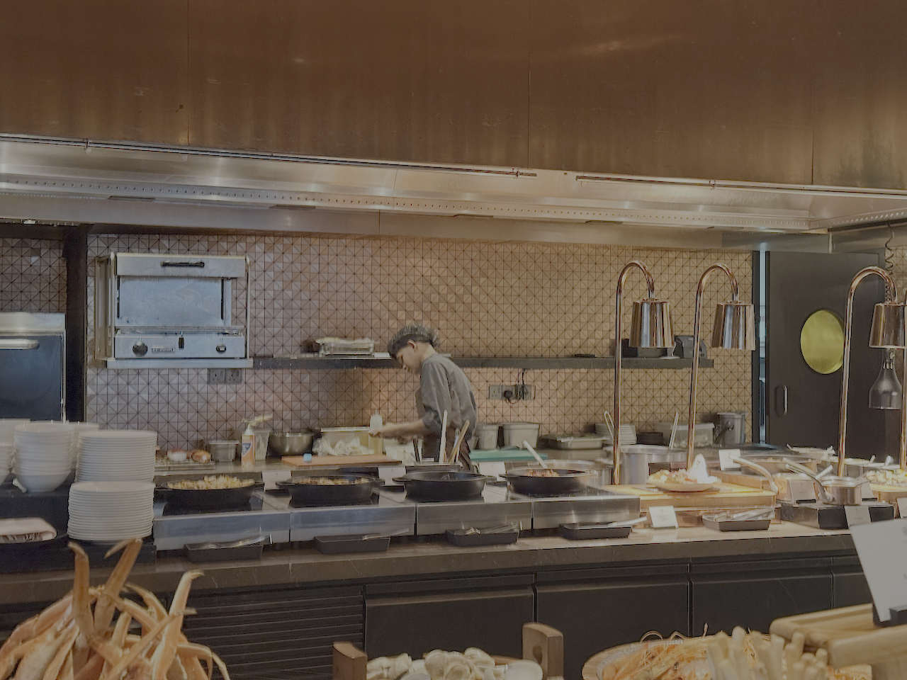 But the real excitement unfolds at the live cooking stations. Guests can order dishes prepared fresh to the table, including premium grilled selections from the Mibrasa charcoal oven.