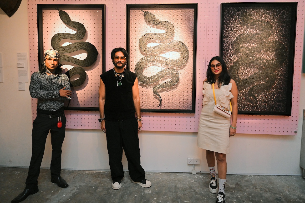 The exhibition opens with *MYTHS of Aura*, a quartet of works embodying Renewal, Spirituality, Enlightenment, and Passion. Each piece carries the hallmarks of Chandran’s mastery, now softened by restraint and intention. Recognised by Christie’s London, the collection bridges fashion and fine art with meditative grace.