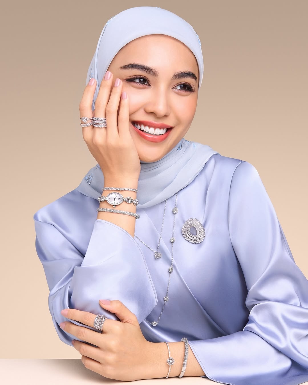 Eyka Farhana embodies the collection’s luminous charm, while Mimi Lana elevates rose-gold tones with sparkling Mesmera and Sublima pieces, perfect for intimate iftars or Eid soirées. Sharifah Rose offers a contemporary take with rhodium-plated classics, including Una Angelic necklaces and expressive statement rings. For those who love wearable sparkle, Swarovski watches like the Imber Bangle, Dextera Octagon, and Gema Watch seamlessly blend festive elegance with everyday style.
